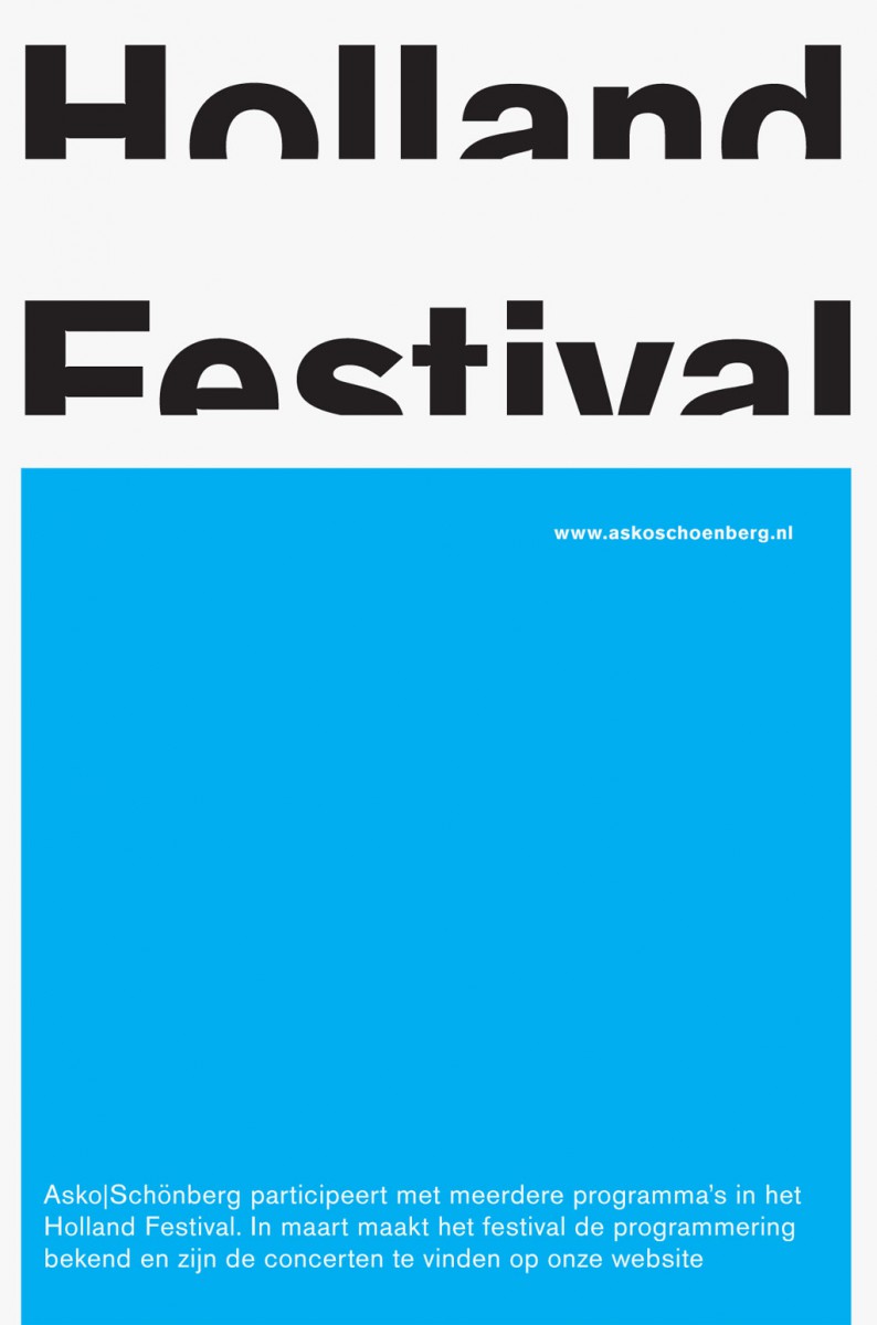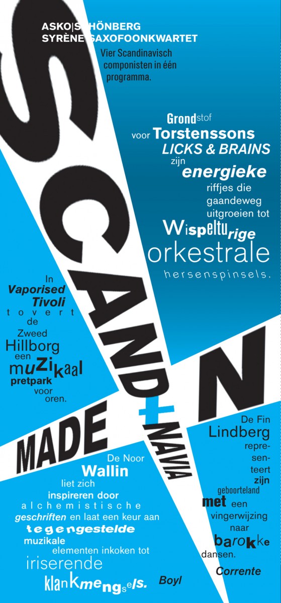 Typografische aankondigingen voor de het Asko Schönberg Ensemble. Elk concert zijn eigen aankondiging. waarbij de muziek stijl, biografieen ect als inspiratie en uitgangspunt dienen