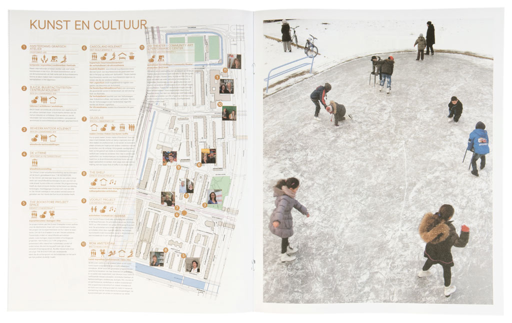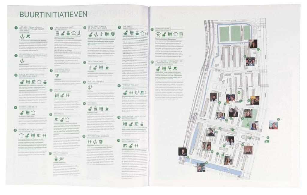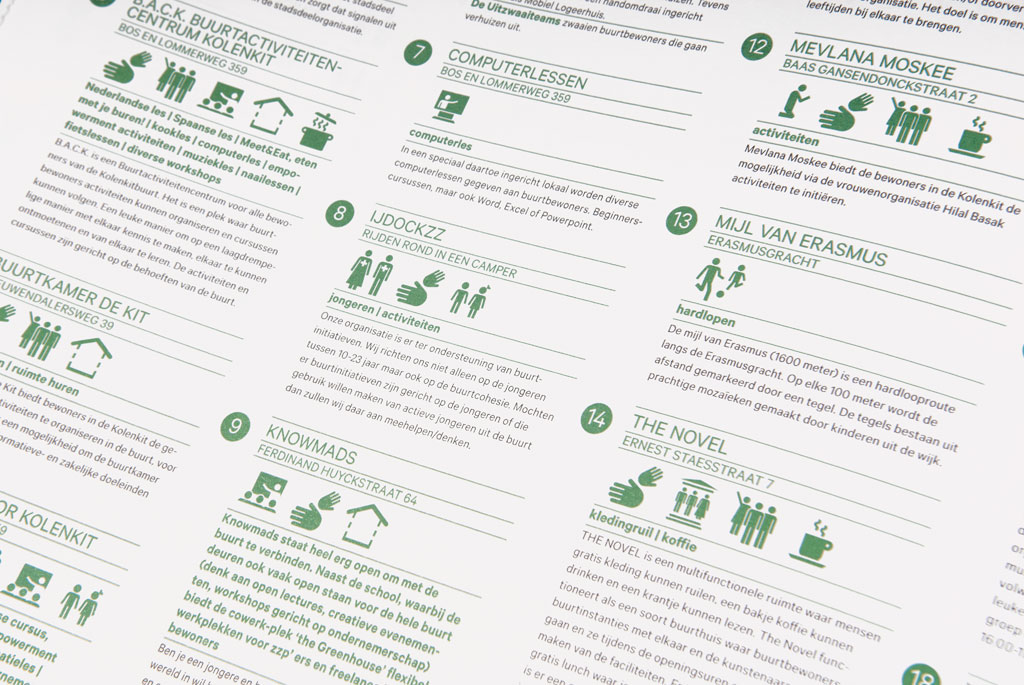 Om de bewoners van de Kolenkit zo goed mogelijk inzicht te geven in de activiteiten van de wijk, werd een publicatie ontwikkeld met een aantal thematische kaarten. Door te werken met thema’s en specifieke kaarten wordt op toegankelijke wijze gezichten en initiatieven gekoppeld aan activiteiten.