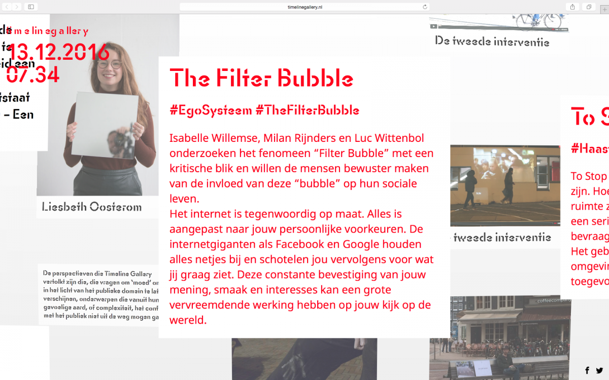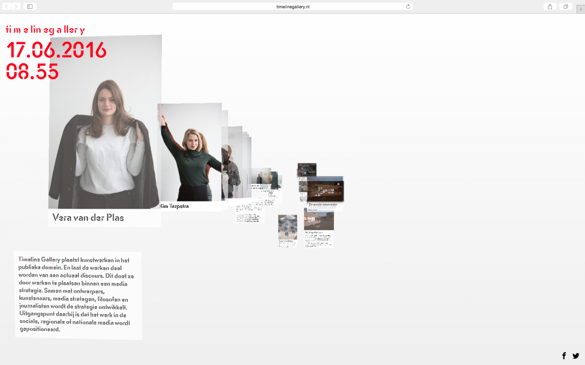 Timelinegallery is een format dat zich afspeelt in de tijd. De website is chronologisch van opzet. De gebruiker kan in de tijd op zoek naar werken, makers, en betekenissen.