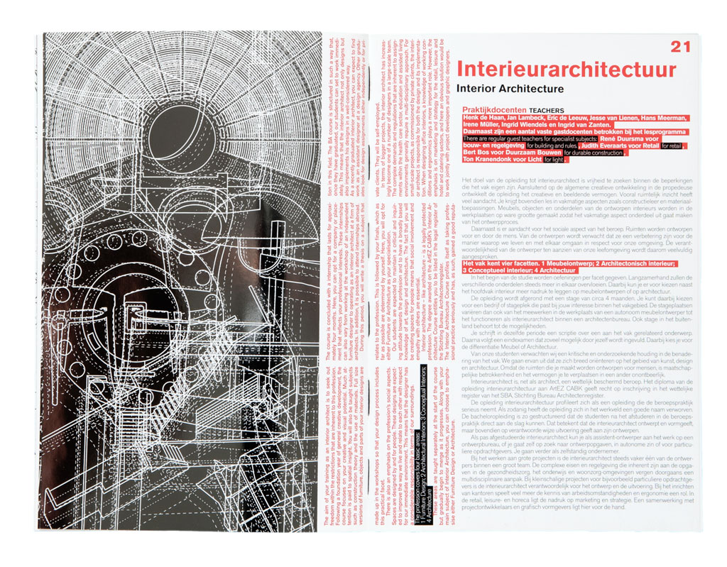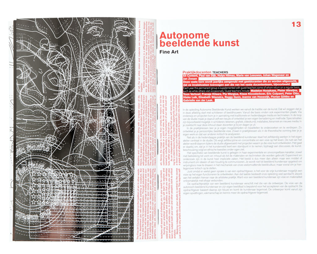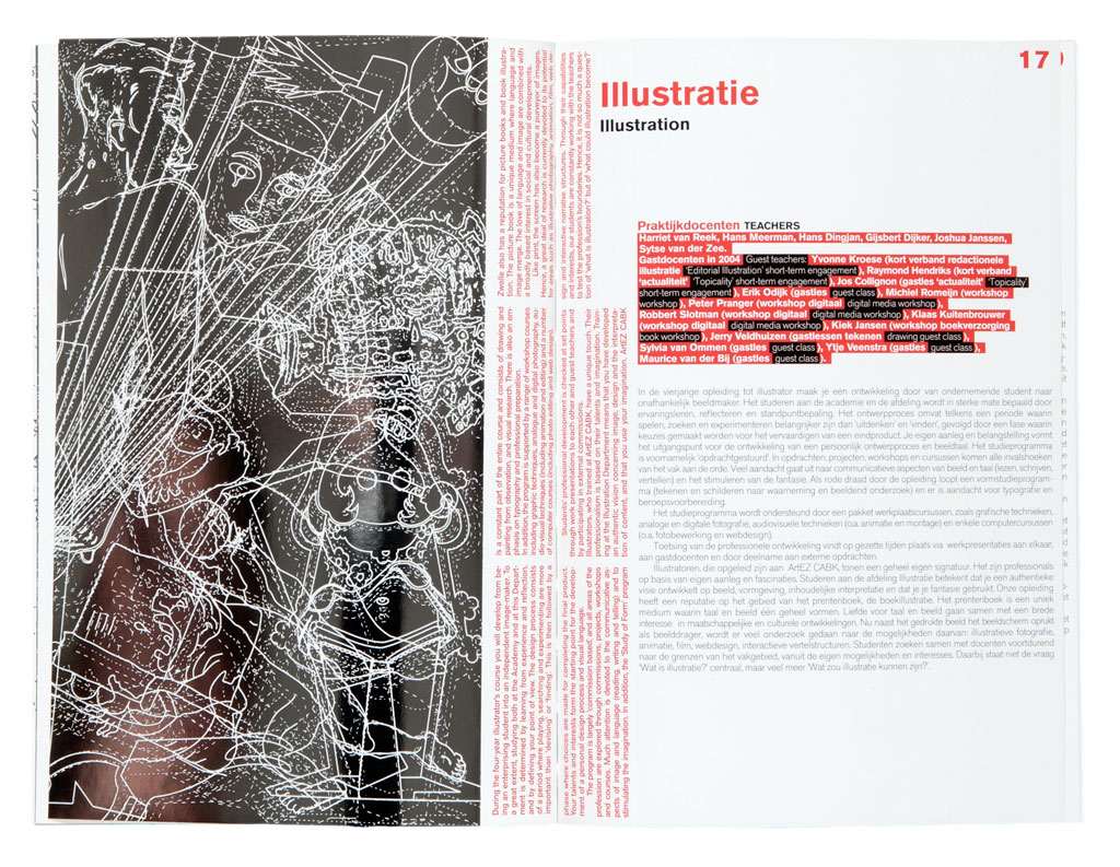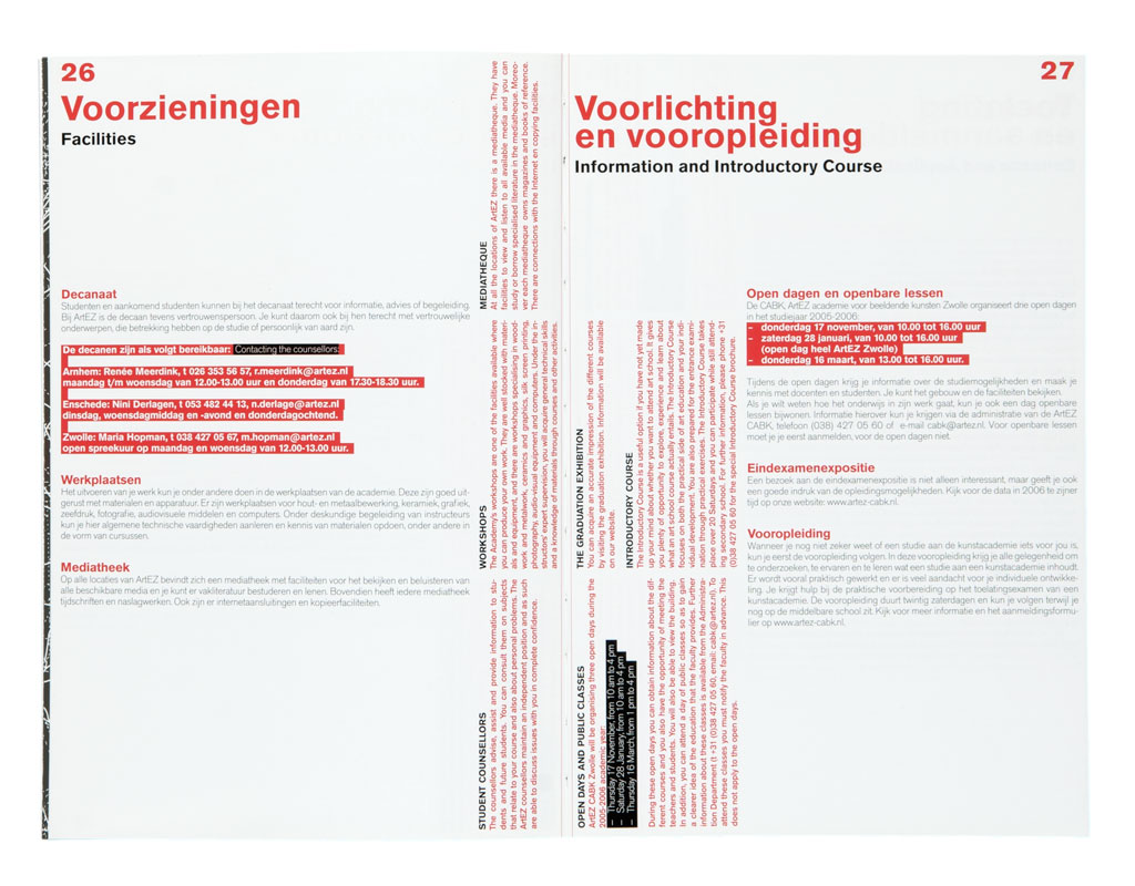 In informatie brochures staan vaak afbeeldingen. Op deze afbeeldingen wordt vaak een sfeer weergegeven die op een academie of universiteit voelbaar is. Voor de informatie brochure van ArtEZ Zwolle is er gewerkt met spiegelende pagina’s. Centraal staat daarmee hoe de student zichzelf kan zien in de context van een vakgebied.
