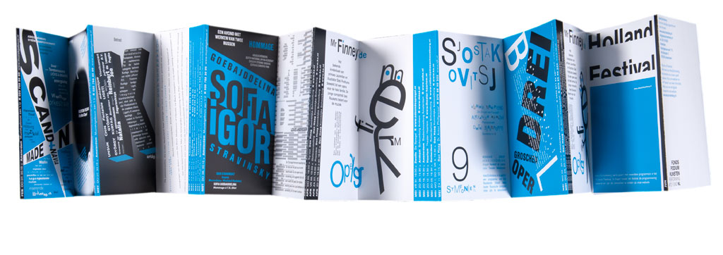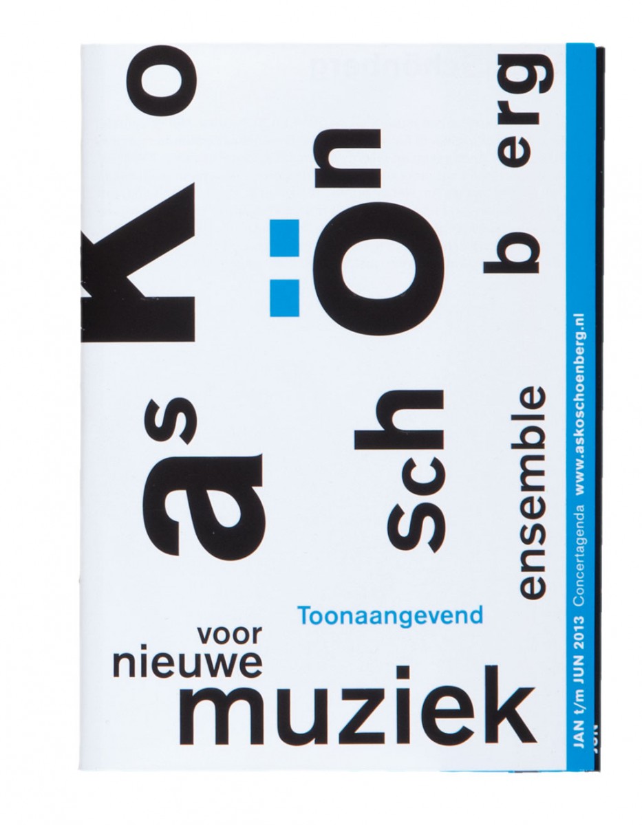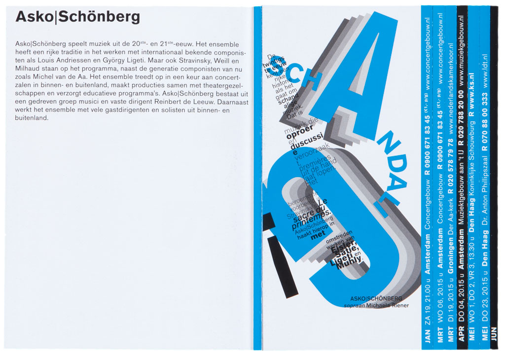 De seizoensbrochure voor het Asko Schönberg ensemble is een publicatie met een typografische weerspiegelingen van de muziekstukken die het Asko Schönberg ensemble ten uitvoer zal brengen. Door het vouwen van een getrapte Leporello ontstaat een boekje met tabbladen. De tabbladen zijn agenda data.