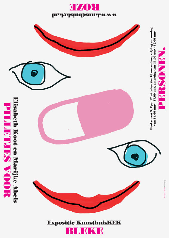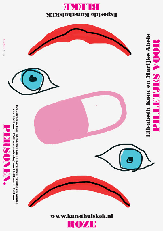 Als een vriend of familielid verdrietig is, willen we dolgraag iets voor die persoon betekenen. Maar de grote vraag is steeds: hoe? Dit affiche is een interpretatie op het thema ‘troosten’, het thema van de tentoonstelling ‘Roze pilletjes voor bleke personen’ van de kunstenaars Marijke Abels en Elisabeth Koot.