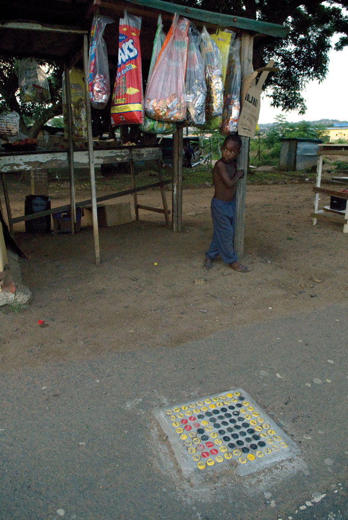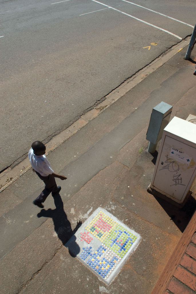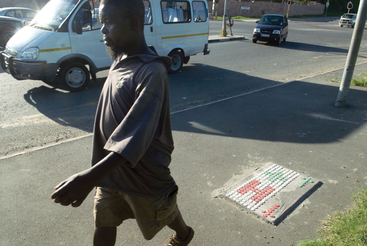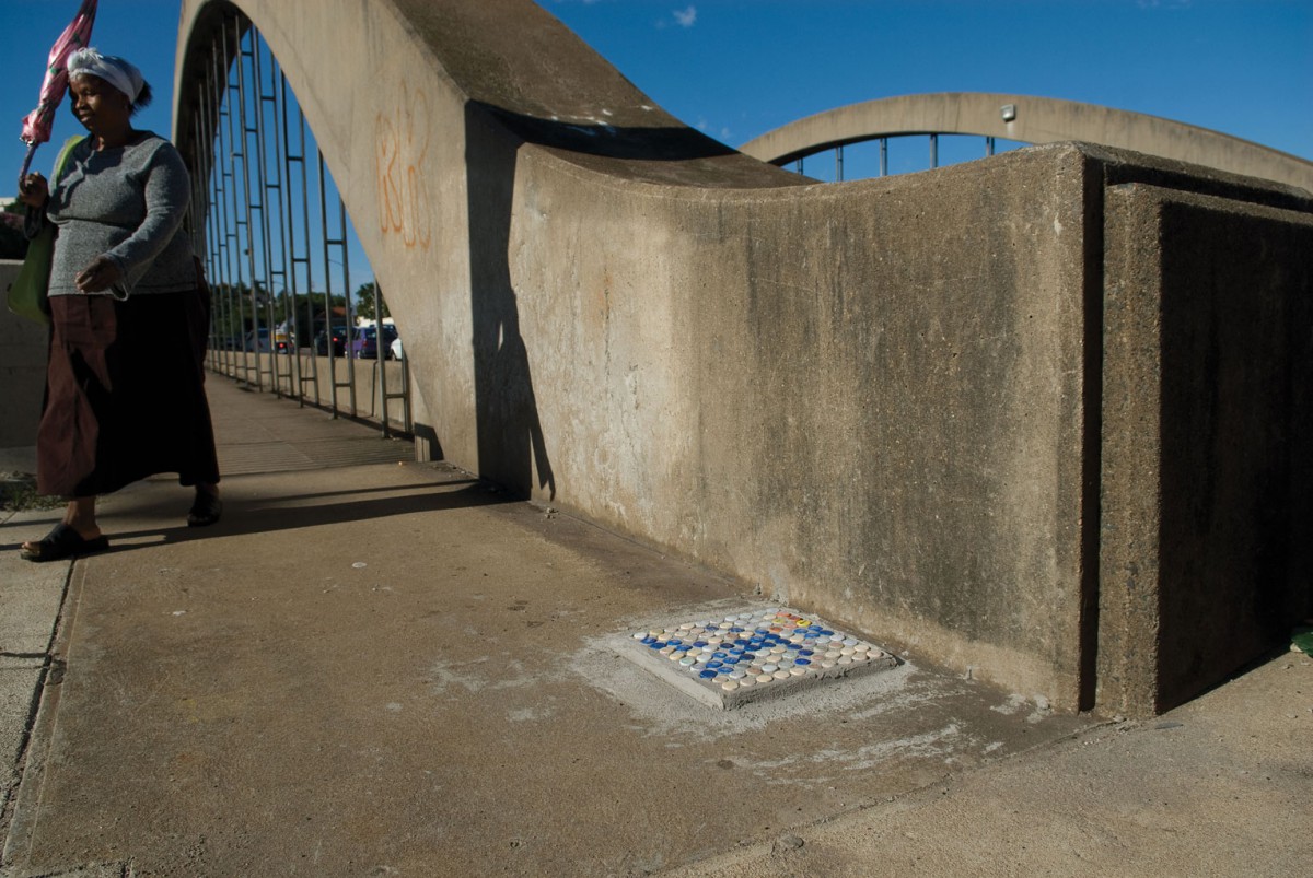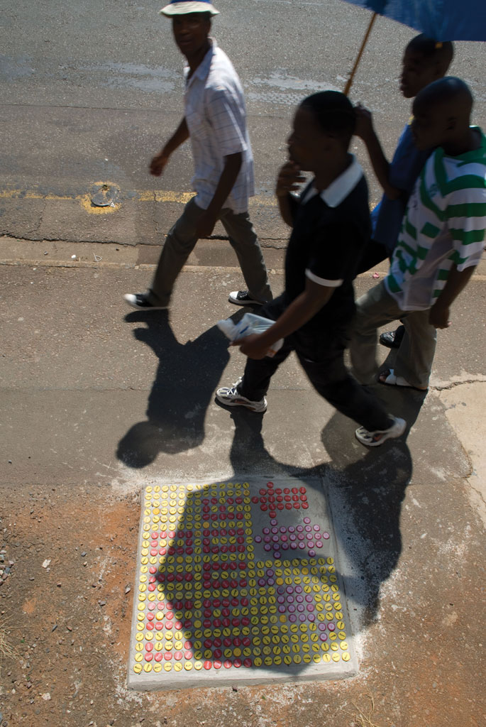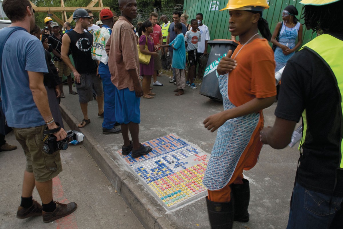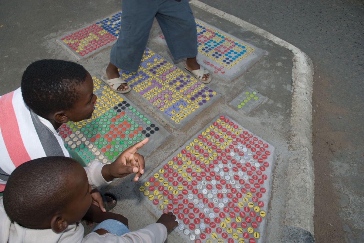 Samen met inwoners van Cato Manor hebben we daarom een eigen ‘bewegwijzering’ ontworpen. Er is gekozen om deze te vervaardigen van beton en flessendoppen, omdat deze materialen geen waarde hebben en niet als brandstof kunnen dienen. Bovendien is deze methode makkelijk te kopiëren.