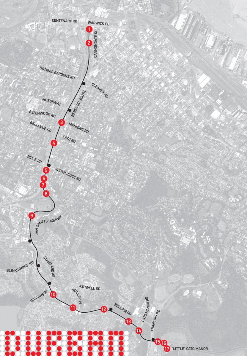 Dagelijks lopen 50.000 bewoners van het township Cato Manor (Durban, Zuid-Afrika) naar het centrum. De route is informeel en daarom krijgt ze van de lokale ANWB geen verkeersborden. Services, winkeltjes, straatverkopers, maar ook politieburo’s, het ziekenhuis en scholen krijgen in de publieke ruimte geen aandacht in de publieke ruimte.
