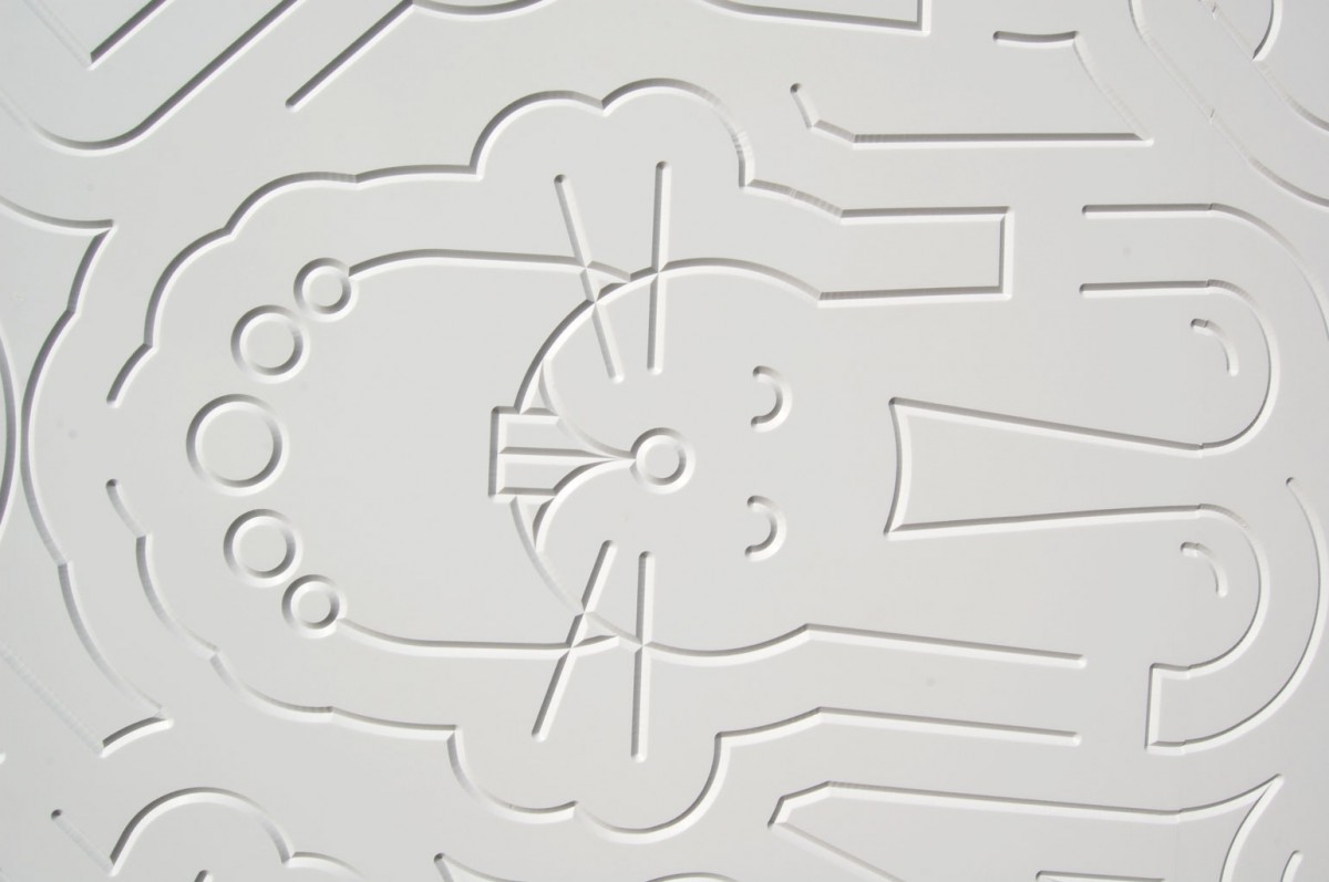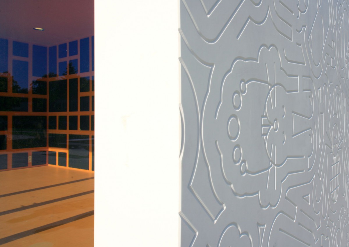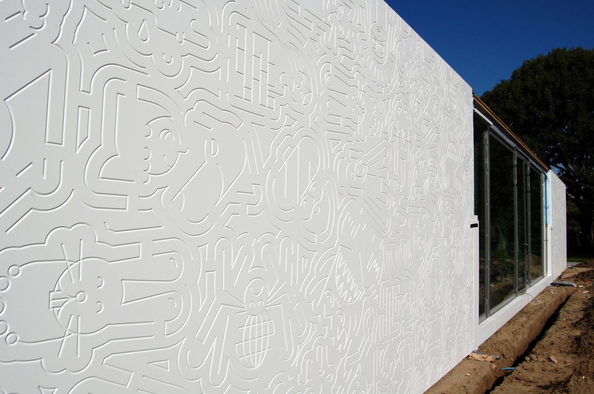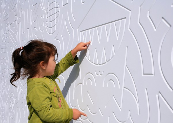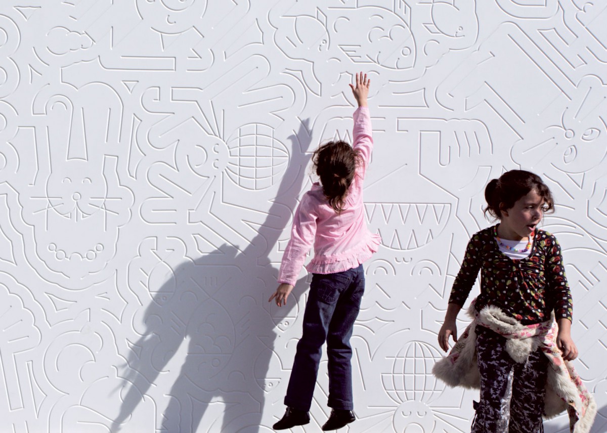De buitenzijde van het gebouw is een tegenhanger van de ‘actieve’ speeltuin met de vele klimrekken en glijbanen. Hier wordt het ontdekkend spelen gestimuleerd door een grote witte gevel waar diverse grillige lijnen in gefreesd zijn. Bij een tweede blik tekenen zich beelden af in het lijnenspel op de gevel: speelse afbeelding en van sprookjes uit alle windstreken. De verhalen en het visueel vocabulair zijn in samenwerking met buurtkinderen ontwikkeld. Op deze manier wordt een gevoel van verantwoordelijkheid voor het paviljoen overgedragen.
