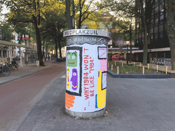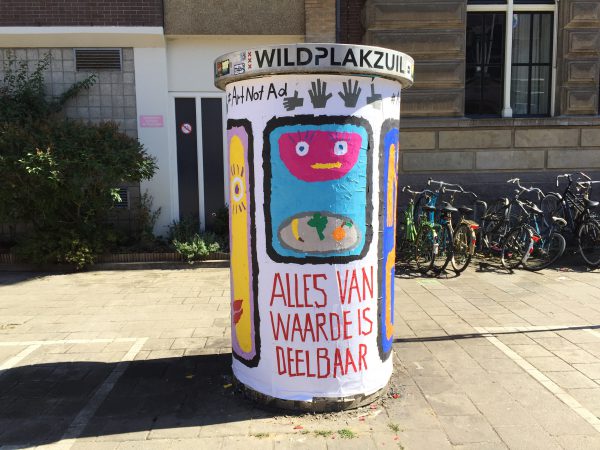 Is er in de publieke ruimte plek voor discursieve beelden, die aanzetten tot een dialoog? Er is officieel ruimte op de zogenaamde wildplakzuilen in Amsterdam. De zuilen zijn gereserveerd voor culturele uitingen en het delen van ideeën en opvattingen. In de praktijk worden deze ruimtes ingevuld door grote commerciële partijen, die er events, concerten en festivals aankondigen. De zuilen worden dagelijks overplakt met aankondigingen van nieuwe events en activiteiten.