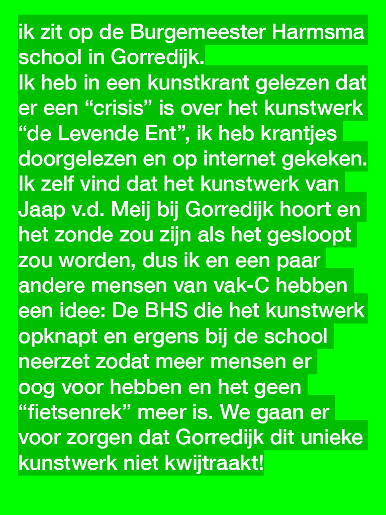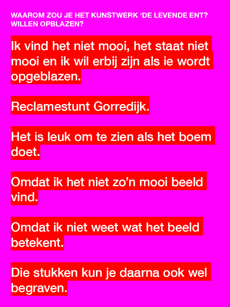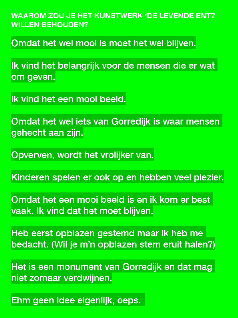 De inwoners van Gorredijk kregen de mogelijkheid in een door DesignArbeid georganiseerd referendum zich uit te spreken over de toekomst van het kunstwerk ‘de Levene Ent’ van Jaap van der Meij.