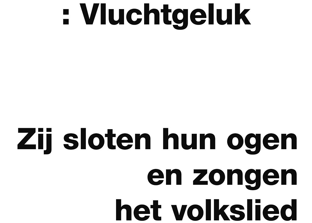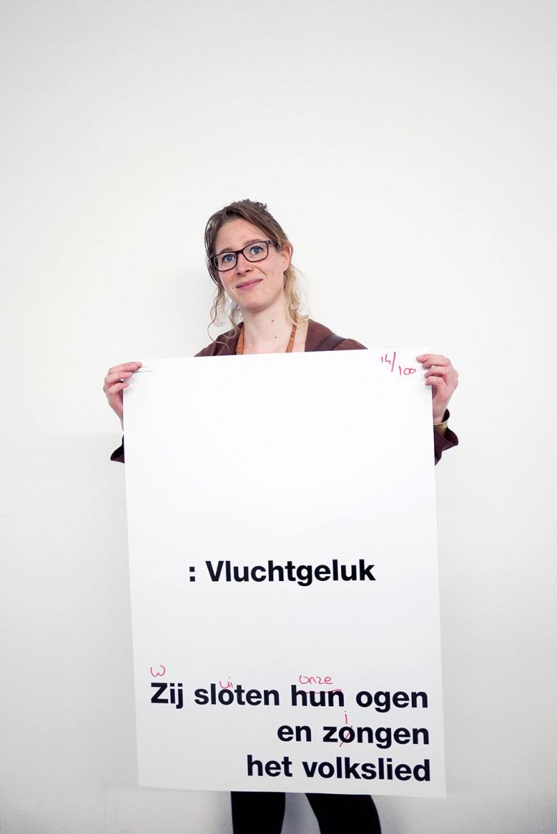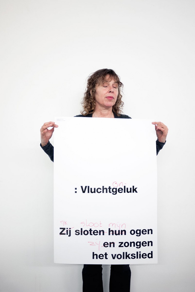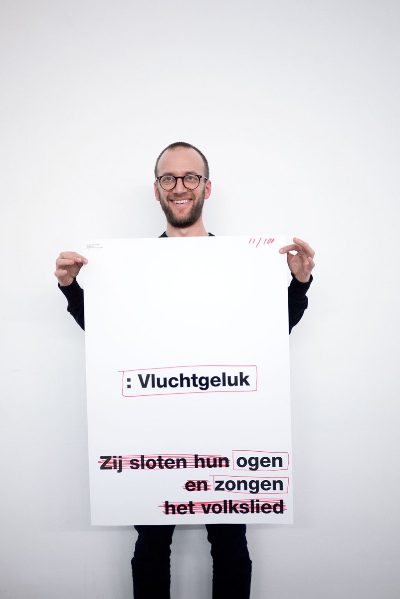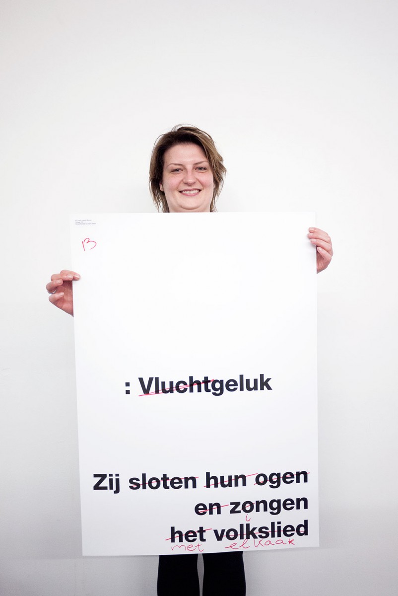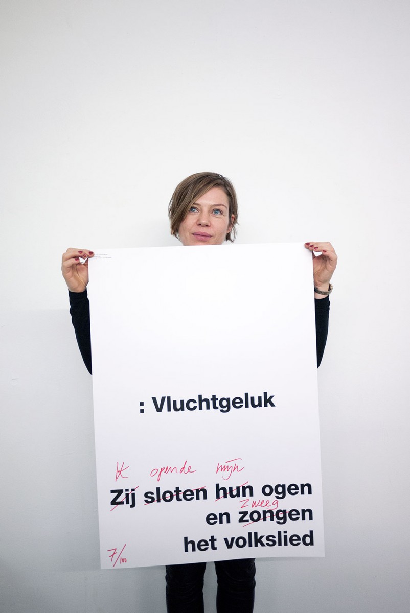Het project :Vluchtgeluk laat deelnemers op een andere wijze naar hun rol in het vluchtelingenvraagstuk kijken. Deelnemers mogen een poster meenemen op de voorwaarde dat ze een aanpassing doen in de tekst. Hoe de tekst wordt aangepast en wat de nieuwe betekenis wordt van de print is aan de gebruiker, maar hij reageert te allen tijde op de inhoud van het oorspronkelijke beeld. Alle deelnemers krijgen de eigen print, maar deze blijft tegelijkertijd deel van het geheel, deel van de serie.